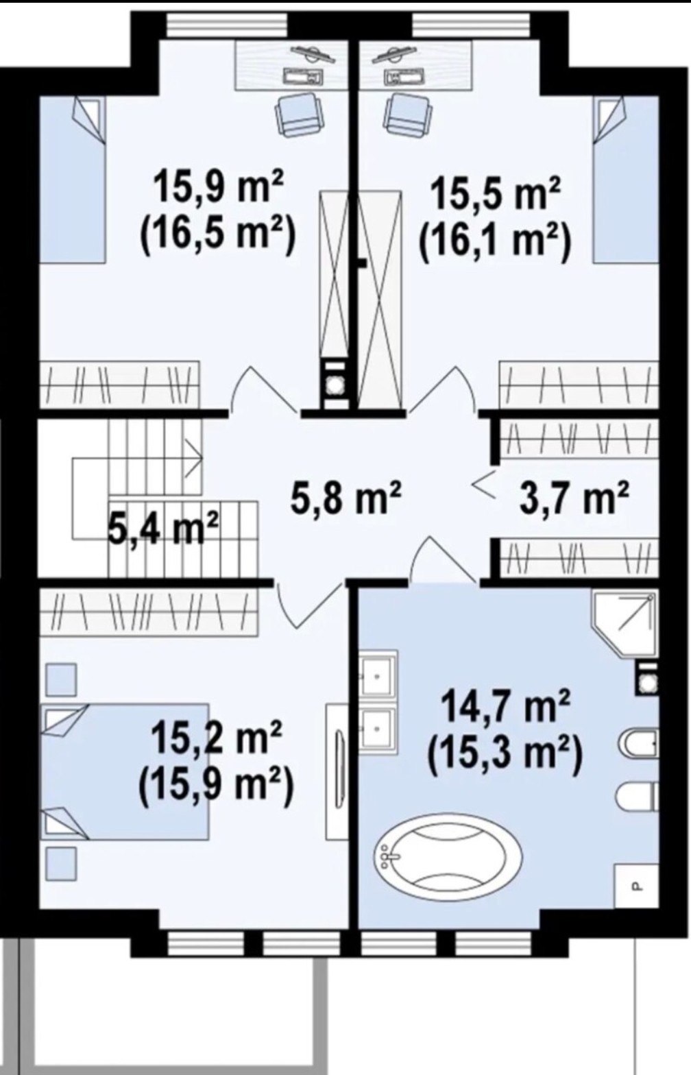 – Łazienka: 14,7 m² (po podłodze 15,3 m²)