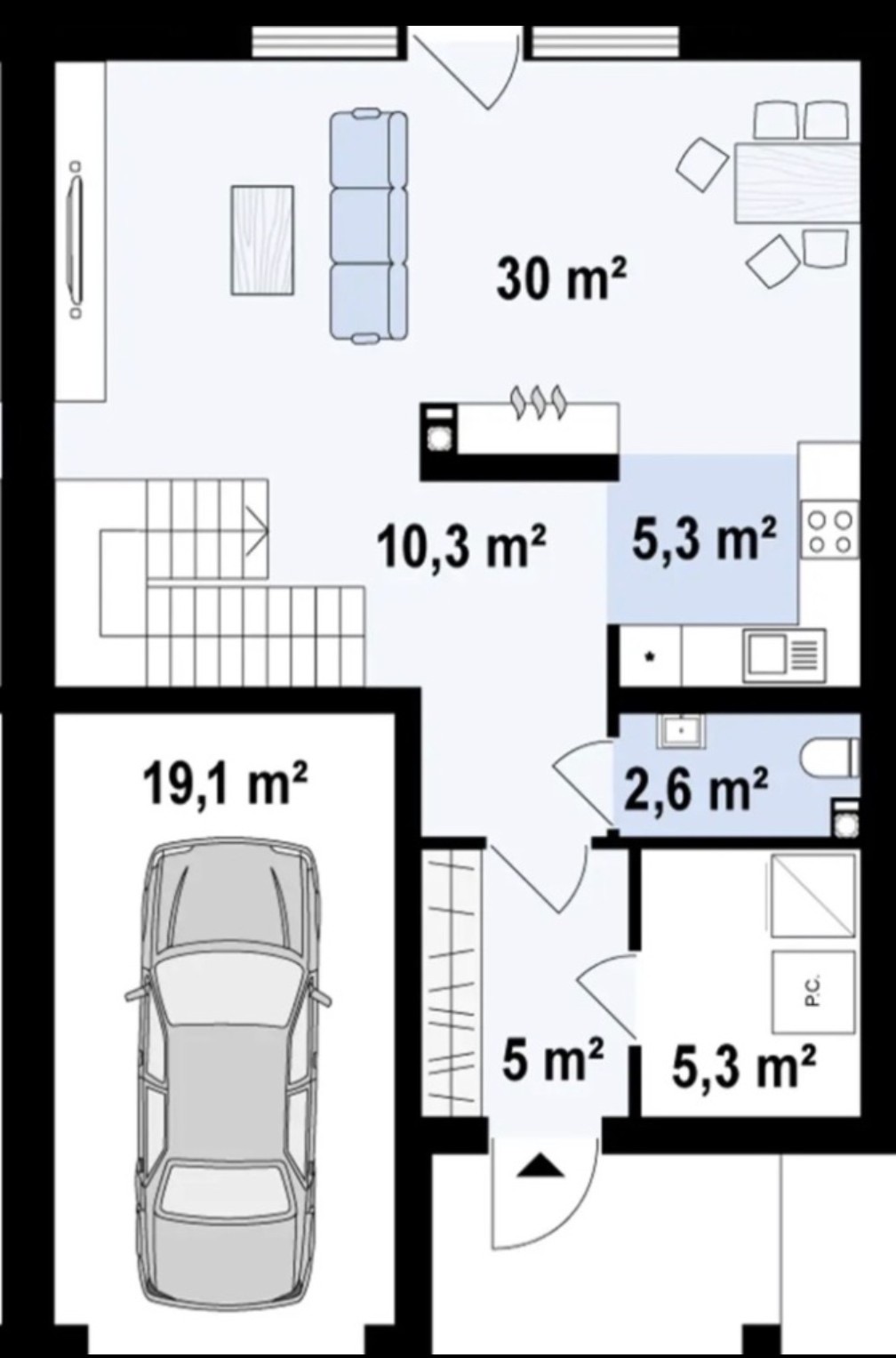 Dom charakteryzuje się praktycznym i przestronnym rozplanowaniem, z wyraźnym podziałem na strefę dzienną na parterze i prywatną na piętrze.