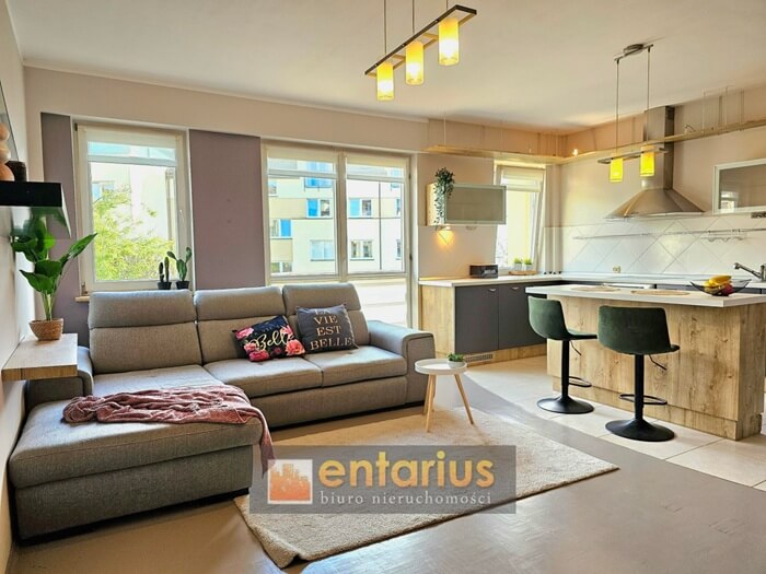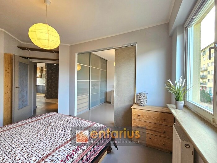 • 3 pokoje: salon z aneksem kuchennym, sypialnia połączona z dodatkowym pokojem, łazienka z kabiną prysznicową, osobne WC z pralką
